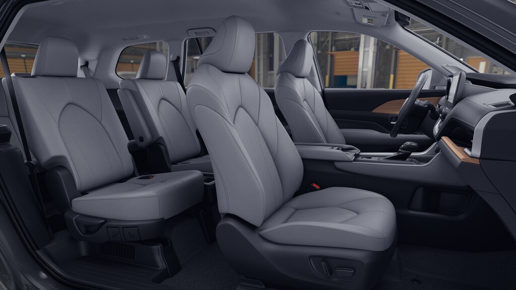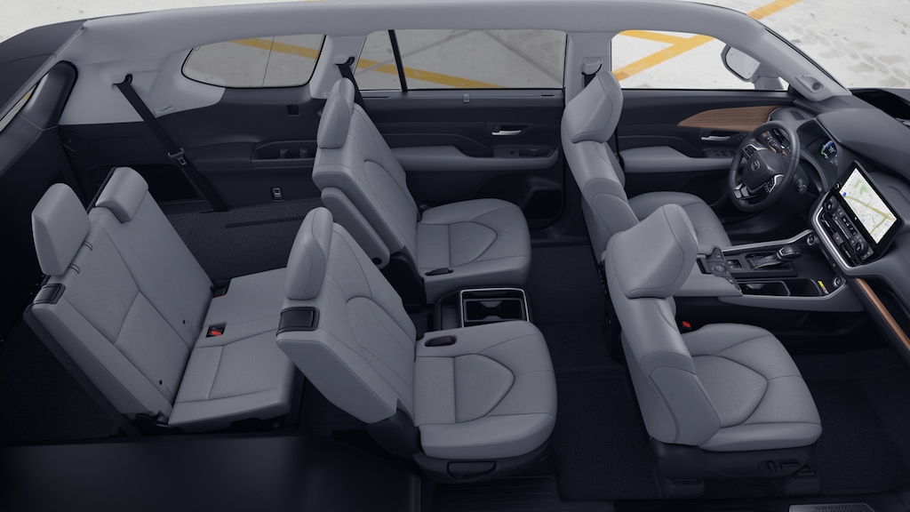• 7-passenger seating with second-row fold-down captain's chairs and fold-down inboard armrests, adjustable headrests and two cup holders mounted on the floor; and 60/40 split, fold-down third-row seats with sliding headrests and recline function.